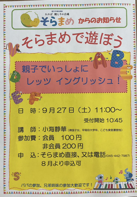 2025/08/27 そらまめ 親子でいっしょにレッツ・イングリッシュ! 9/27 お問い合わせ 親と子のつどい広場 そらまめ 045-442-7987 tagPlaceholderカテゴリ: そらまめ