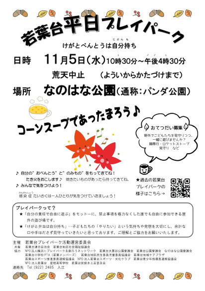 2025/11/05 若葉台平日プレイパーク 11/5 連絡先 入江 045-922-2485 2024年度 若葉台プレイパーク年間スケジュールはこちら★ 過去の若葉台プレイパークの様子はこちら★ tagPlaceholderカテゴリ: pickup, プレイパーク